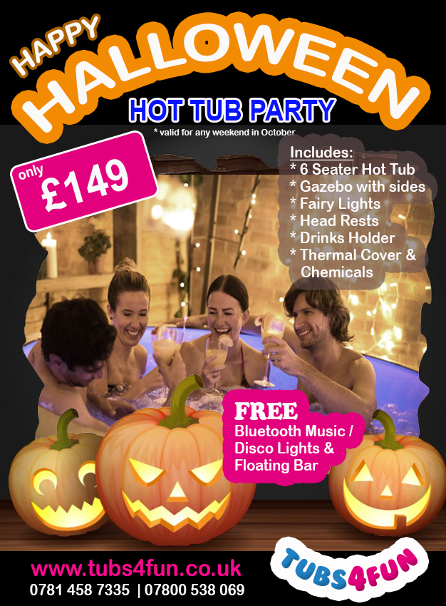 We have a fantastic Halloween Hot Tub Party Special for only £149 for the weekend. The package includes a 6 seater hot tub, gazebo with side panels, fairy lights, head rests, drinks folder, thermal cover and FREE bluetooth music with disco lights and floating bar. The offer is available for any weekend in October. Areas we delivery to are Buckinghamshire, Berkshire, Middlesex and Oxfordshire. To see more info and book online, visit www.tubs4fun.co.uk