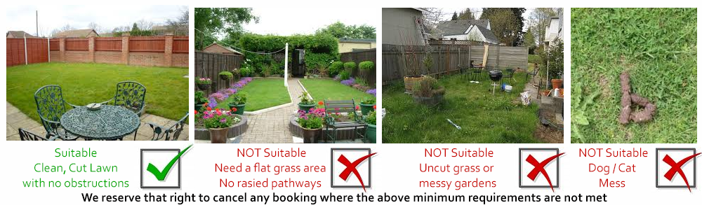 Please ensure that there is adequate space for our products, that the location our products will be sited is accessible, and that you have cleared the area of mess and debris. We will be unable to provide a refund if we cannot deliver your product due to a lack of space or accessibility or due to an inappropriate location.